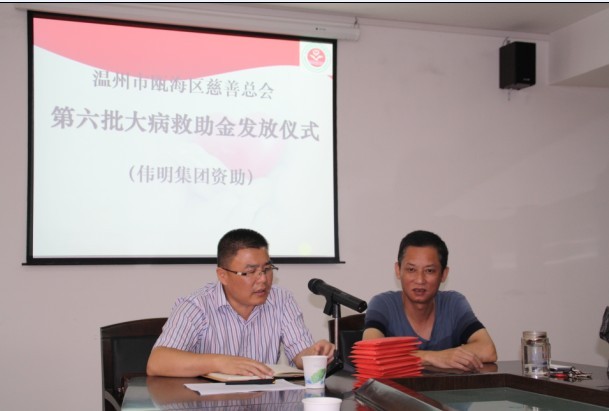 本报讯 8月16日,公司副总裁章小建代表伟明慈善分会在瓯海慈善总会会议室发放2013年第六批大病救助金,旨在对因重大疾病和突发性灾害,家庭基本生活暂时出现特别困难的家庭进行救助。近几年提高救助额度,加大了对重大疾病患者的救助力度。