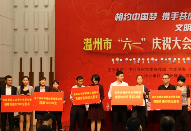 5月23日下午,温州市“六一”庆祝大会在市博物馆隆重举行。温州市各县(市、区)委宣传部、妇联、文明办、教育局、团委、关工委负责同志,儿童代表及各类先进代表等近300人参加大会。今年会app平台在活动现场为各县(市、区)“共享蓝天”图书室捐现金书款一万元。