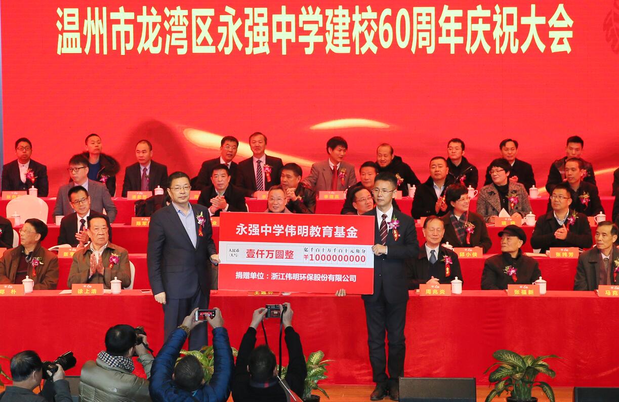 12月17日,永强中学举行60周年校庆活动,伟明环保为永强中学建立了1000万元教育基金,在校庆庆典现场,项光明董事长将捐赠牌交给永强中学校长陈良。