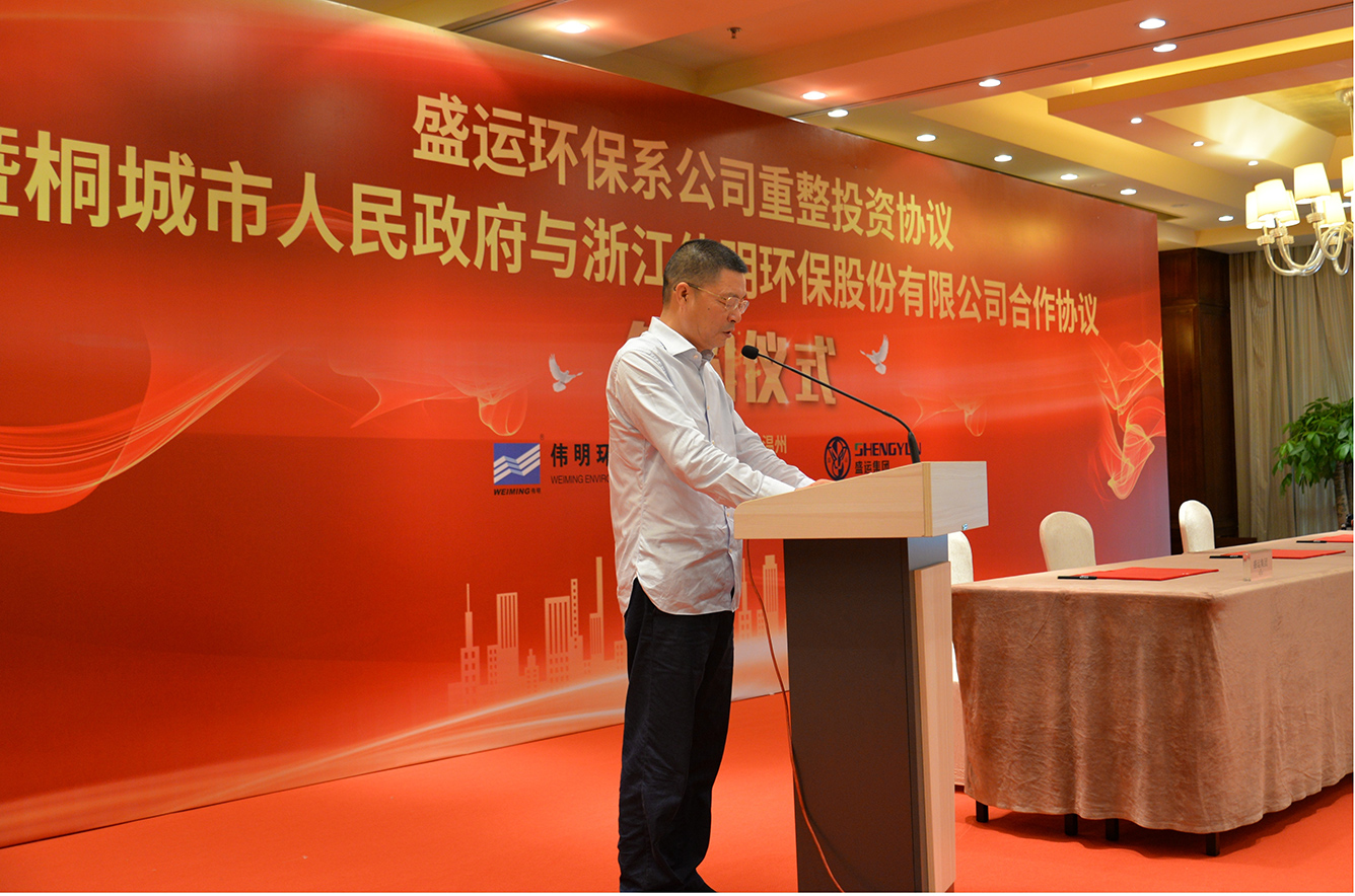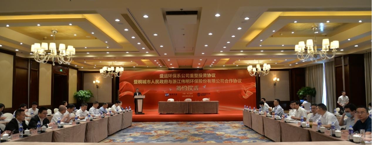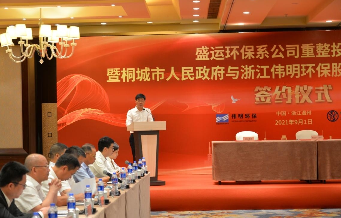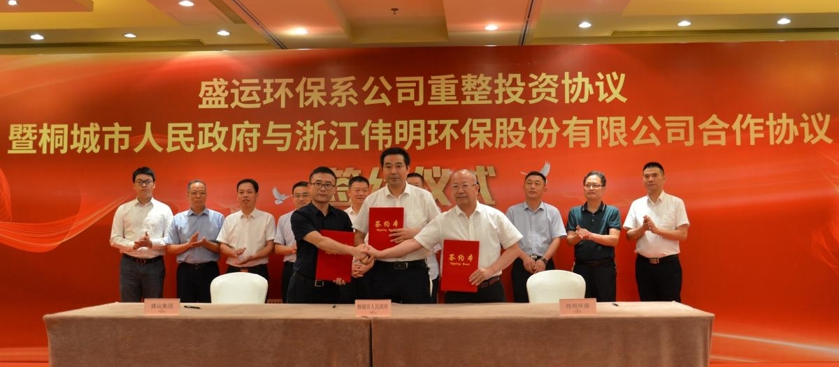 签约仪式上,桂稳成常务副市长、刘玉斌董事长、陈革副总裁代表合作方分别签署盛运环保重整投资协议、桐城市政府与伟明环保合作协议。