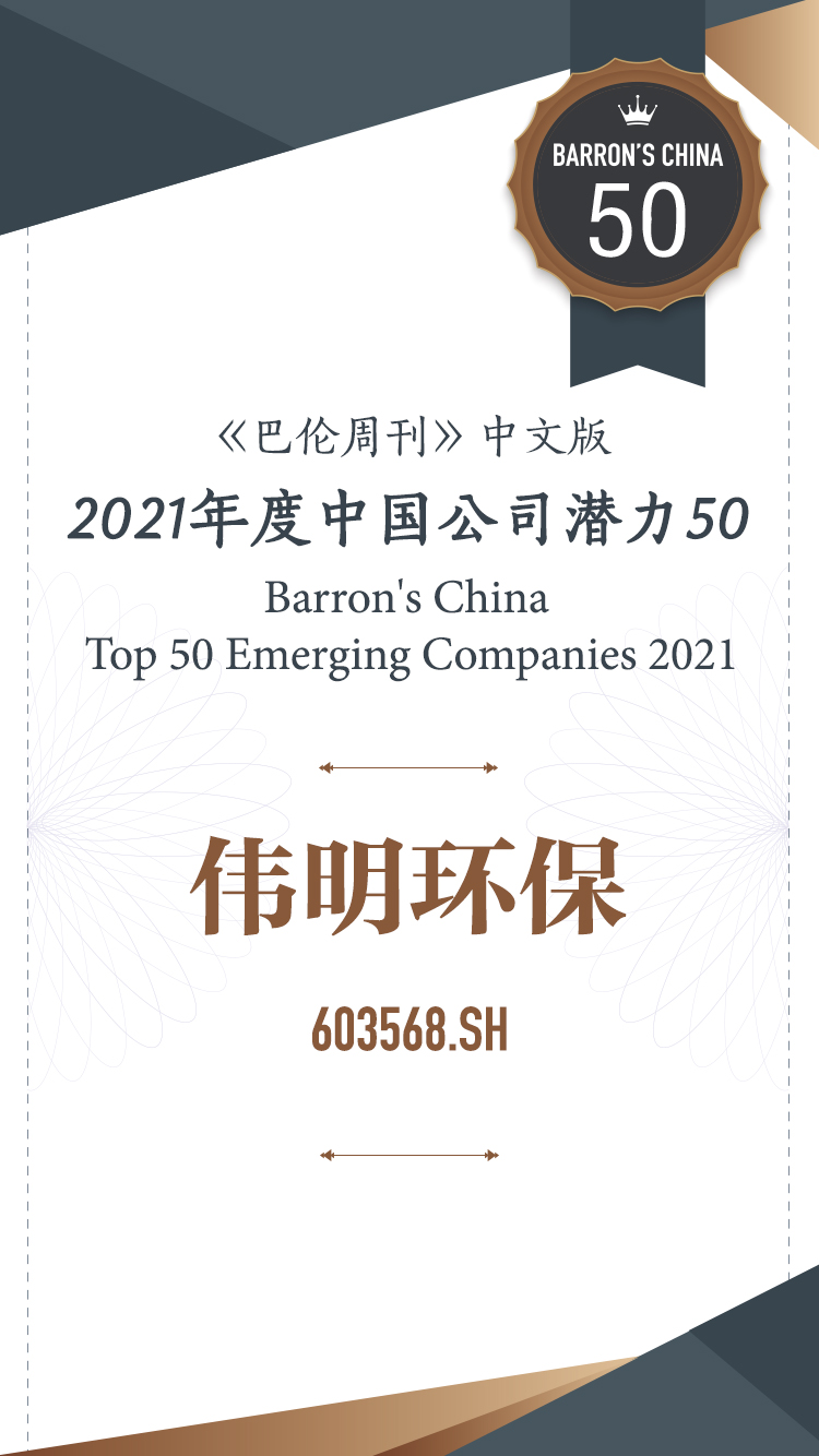 本报讯 近日,《巴伦周刊》中文版“价值潜力”中国公司评选榜单揭晓,伟明环保(603568)凭借稳健的业务发展、出色的经营业绩和突出的价值潜力,荣获“《巴伦周刊》中文版2021年度中国公司潜力TOP50”奖。